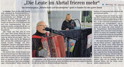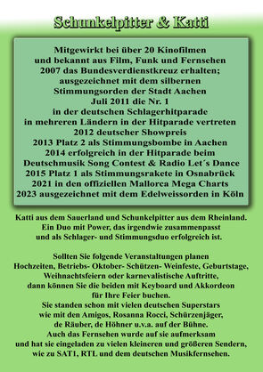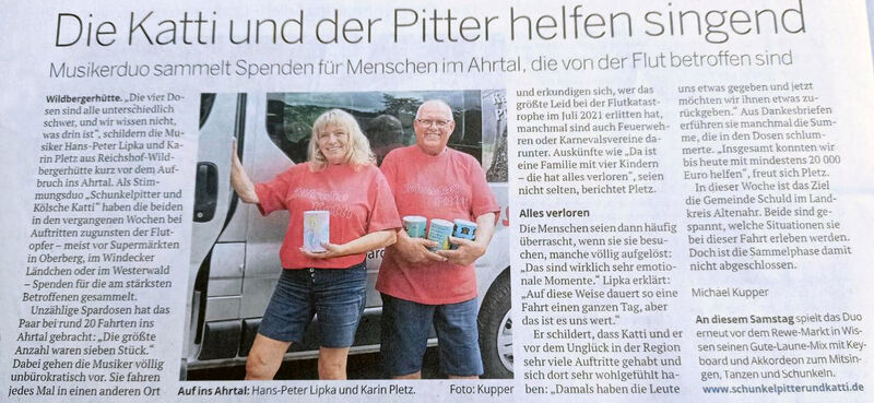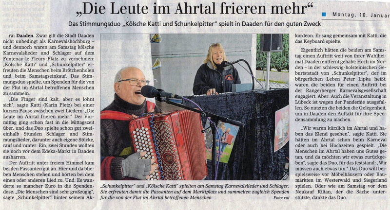Im Rahmen der Fluthilfe spielen das Stimmungsduo „Der Schunkelpitter un et Kölsche Katti“ immer wieder, wenn das Wetter es zulässt, Samstags Livemusik vor Einkaufsmärkten, Möbelhäusern usw. Bei schlechtem Wetter wird es eine...[mehr]
